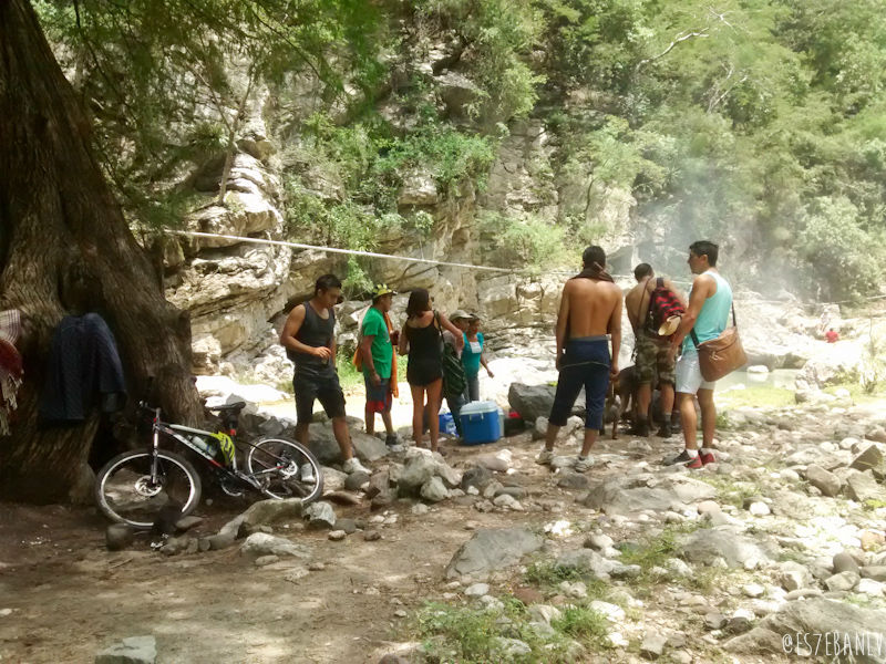 Las cascadas tienen 4 pozas, y obviamente la superior es en la que me iba a quedar yo. La subida no está complicada y bien vale la pena. Puse mis cosas en una piedra más o menos alejada de por donde llegaría toda la gente, y me metí a nadar justo junto a la cascada que cae a la poza de abajo… El agua estaba helada, pero como moría de calor y cansancio (hice 47km en 2h:51m de pedaleo, el tiempo total obviamente es mucho mayor pues cuenta semáforos, paradas en tiendas, etc, a 16km/h y 62km/h max) me cayó increíblemente bien.