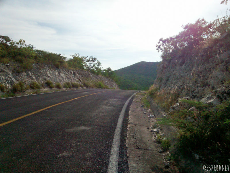Las curvas de bajada hacia la desviación de terracería son muy rápidas, 60km/h sin darte cuenta en bicicleta de montaña. Hay que tener bastante precaución por que son dos carriles angostos y por la vegetación son curvas ciegas.