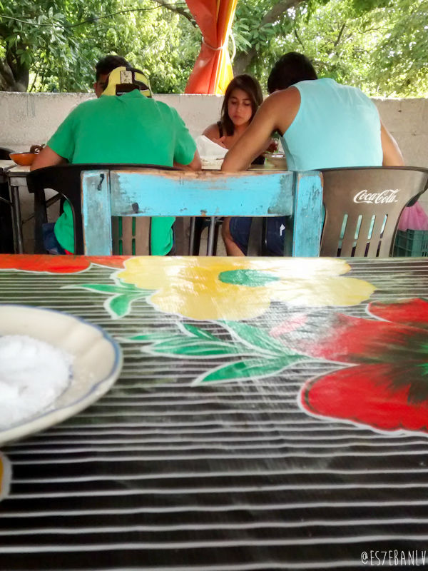 Llegué a El Aguacate y me detuve en el prácticamente único restaurant carretero a comerme unas memelitas (venden guisos, moles, sopa…) y volví a encontrarme al grupo de chicos que encontré por El Cáliz… ¡Creo que la chica me estalqueaba! 😉 Me hice amigo de un gato.